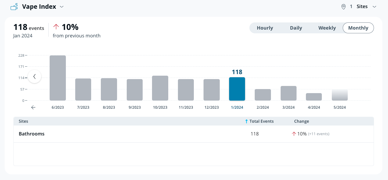 この **イベント分析** ページを使うと、センサーデータの表示と分析が容易になります。どの読み取り値を評価するかを指定して、日次、週次、または月次ベースで生成されるアラートの数を確認できるようになりました。このページには、傾向の把握に役立つ使いやすいグラフと、アラートの総数および関連する変化を示す表があります。
