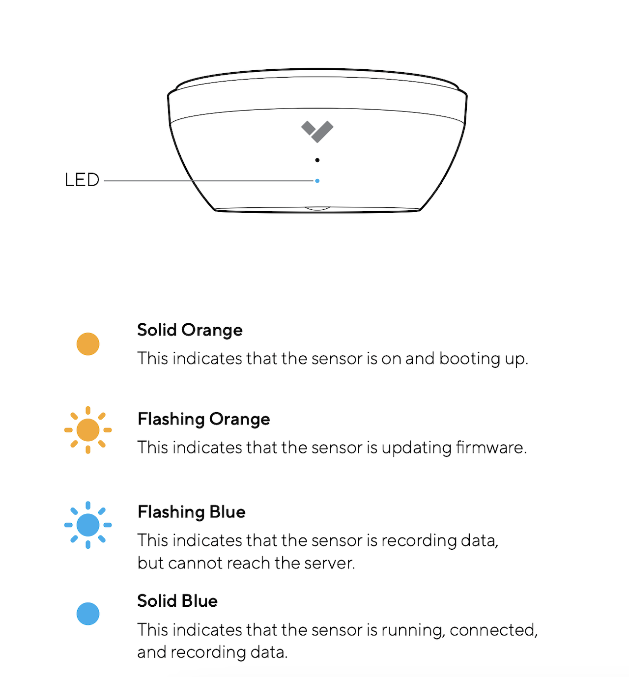 この [SV11](https://www.verkada.com/sensors/sv11/) シリーズは、すべての Verkada カメラと同じ LED の規則に従っています。