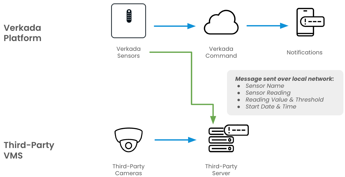 各VMS連携は、メーカーの連携前提条件に応じて異なります。カメラに簡単にリンクできるアラートを受信でき、センサー名、センサーの読み取り値、読み取り値の数値、しきい値を超過したかどうか、およびタイムスタンプが含まれます。