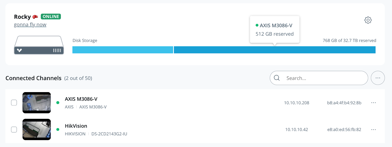 を切り替えて **Disk Storage** をカメラ表示にし <img src="https://2993246688-files.gitbook.io/~/files/v0/b/gitbook-x-prod.appspot.com/o/spaces%2FNje42M0OzzbT2nhzkB3K%2Fuploads%2Fgit-blob-261ba22c2511f94d18729e45eb8a2251dffdab1b%2Ffa5fc41f8e810c58f5abca94ea38c90c4ef58a46.png?alt=media" alt="" data-size="line"> 、消費バーにカーソルを合わせると、各カメラに現在予約されているストレージ容量を確認できます。