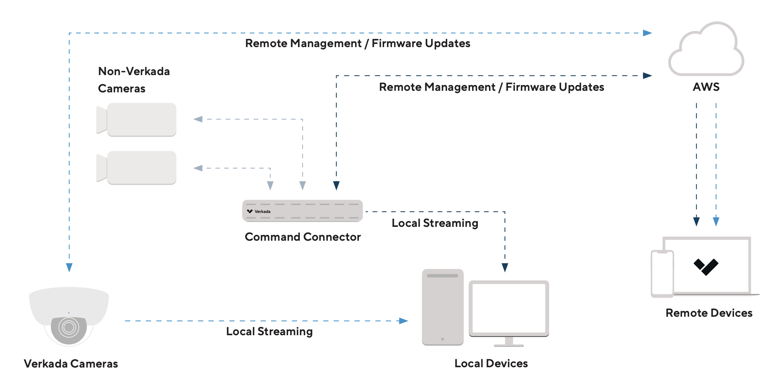 The following diagram outlines a typical setup where the Command Connector bridges non-Verkada camera devices into the Command platform to manage footage and supported features from a centralized platform.