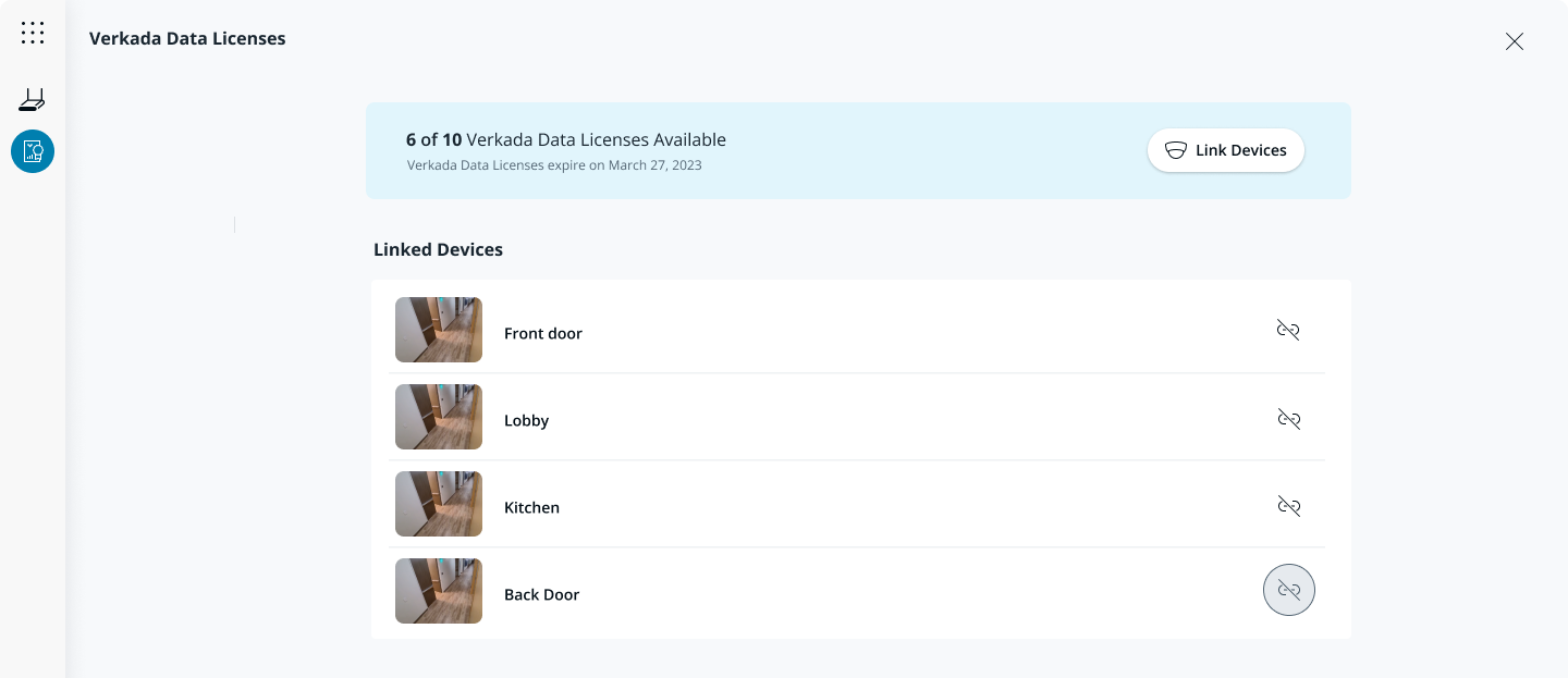 You can link and unlink your data licenses to particular devices connected to the GC31 through the data licensing page on your Verkada Command platform. Any video device connected to a gateway will be automatically linked to an available license.
