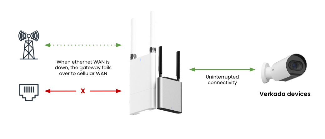 Cellular Gateways support WAN failover mode, which enables the gateway to act as an uplink to your existing network. In WAN failover mode, the Gateway’s cellular connection will act as a failover, helping ensure that your security devices remain online and operational even when your primary network experiences downtime.