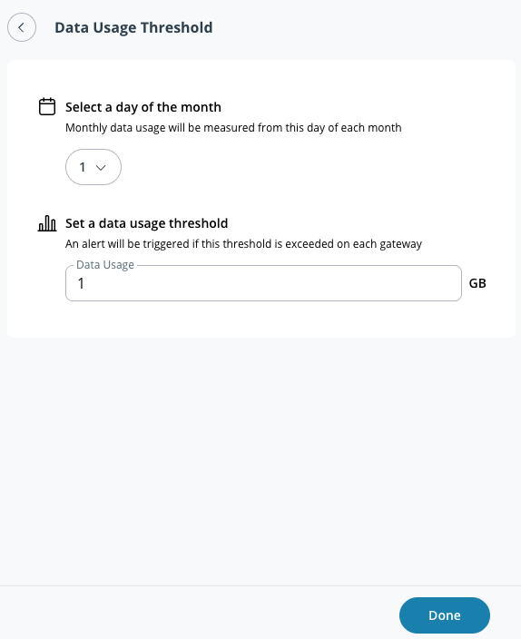 b. Click **Done** and continue with the alert [data usage threshold](#create-alert-greater-than-data-usage-threshold).