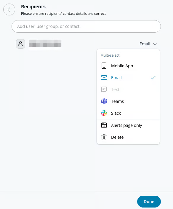 **Select the dropdown menu next to a user or group to choose their notification method(s). Recipients can be notified via push, SMS, messaging-platform alerts, or email.**