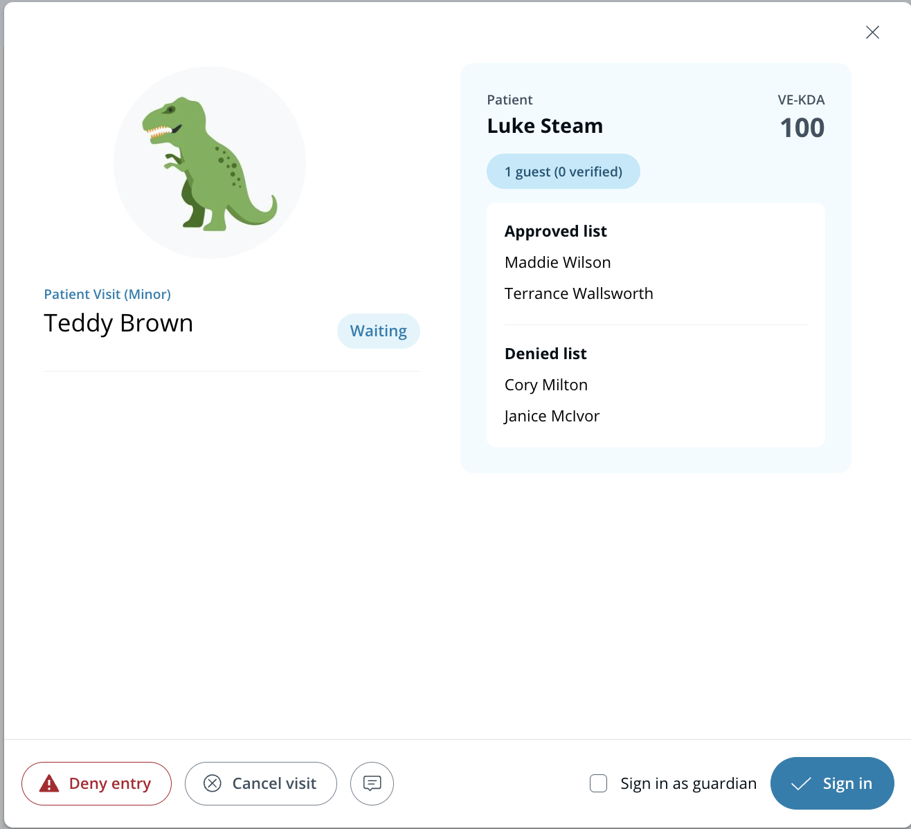 A security screen will be conducted in the background if it is enabled for the Patient Visitor Guest Type. After the security screen is completed, the visitor will appear on the **Waiting** tab.