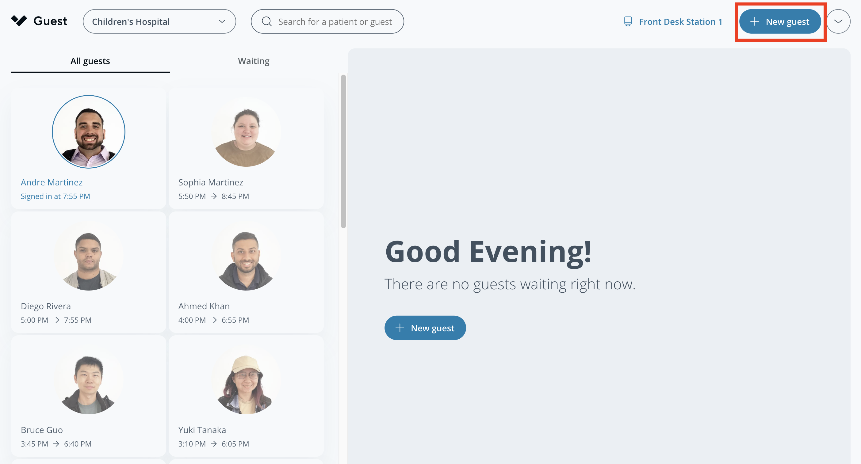 The healthcare portal in Guest helps facilitate patient and department visitors. On this page, Guest users can review visitors and patients across sites.