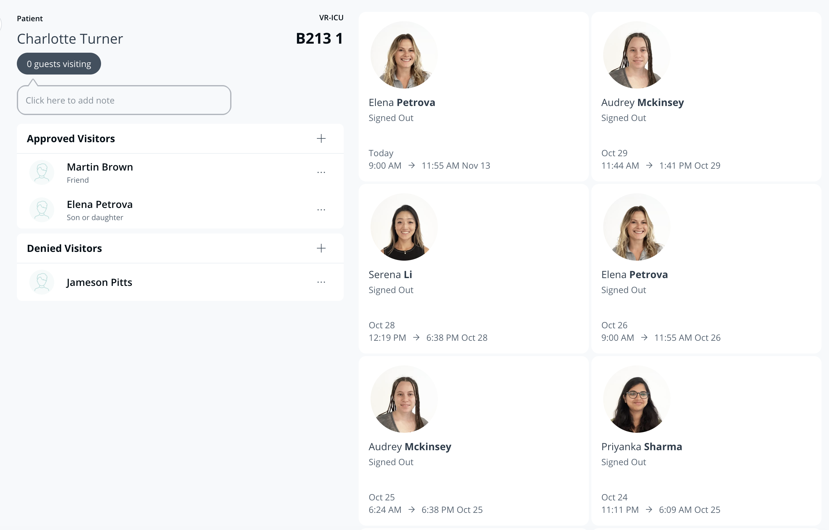 Patient-specific approved and denied visitor lists may be maintained in the patient profile.