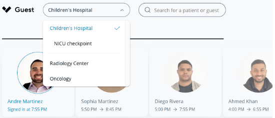 From the healthcare portal, Guest users can sign in, review detailed logs of patient and department visitors, and look at patients. Guest users can jump between sites and checkpoints from the location menu: