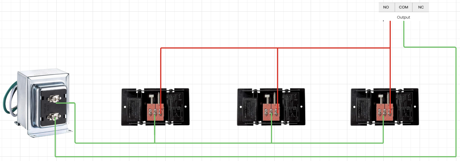**Para cada timbre, conecta los terminales Front y Trans al terminal NO del intercom y al terminal restante del transformador de timbre, respectivamente, como se muestra.**