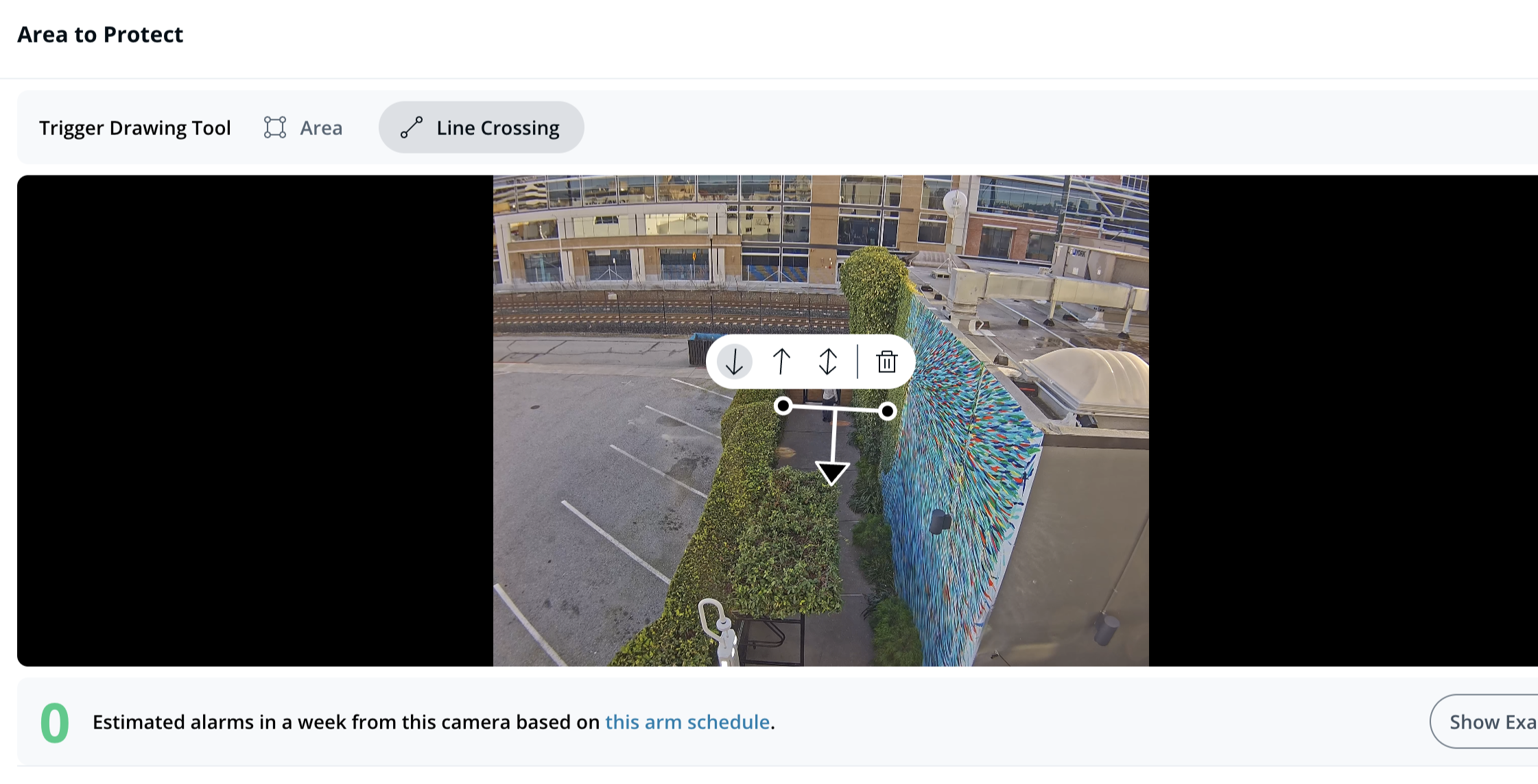Once the protected area is configured, you can see how many alarms are expected to be raised from the selected camera based on the arm schedule and area to protect in the last week.