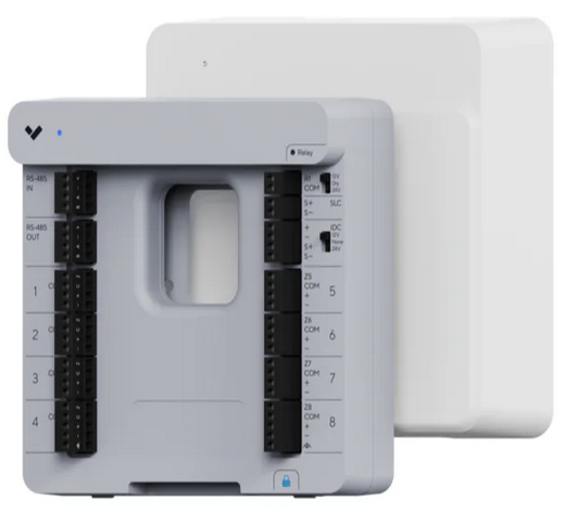BE32は、RS-485経由でBP52に接続した場合、最大8系統の有線ゾーン入力、サイレン/ストロボ出力、最大160台の無線センサーをサポートします。障害物のない見通し距離は最大300フィート（91.44m）です。