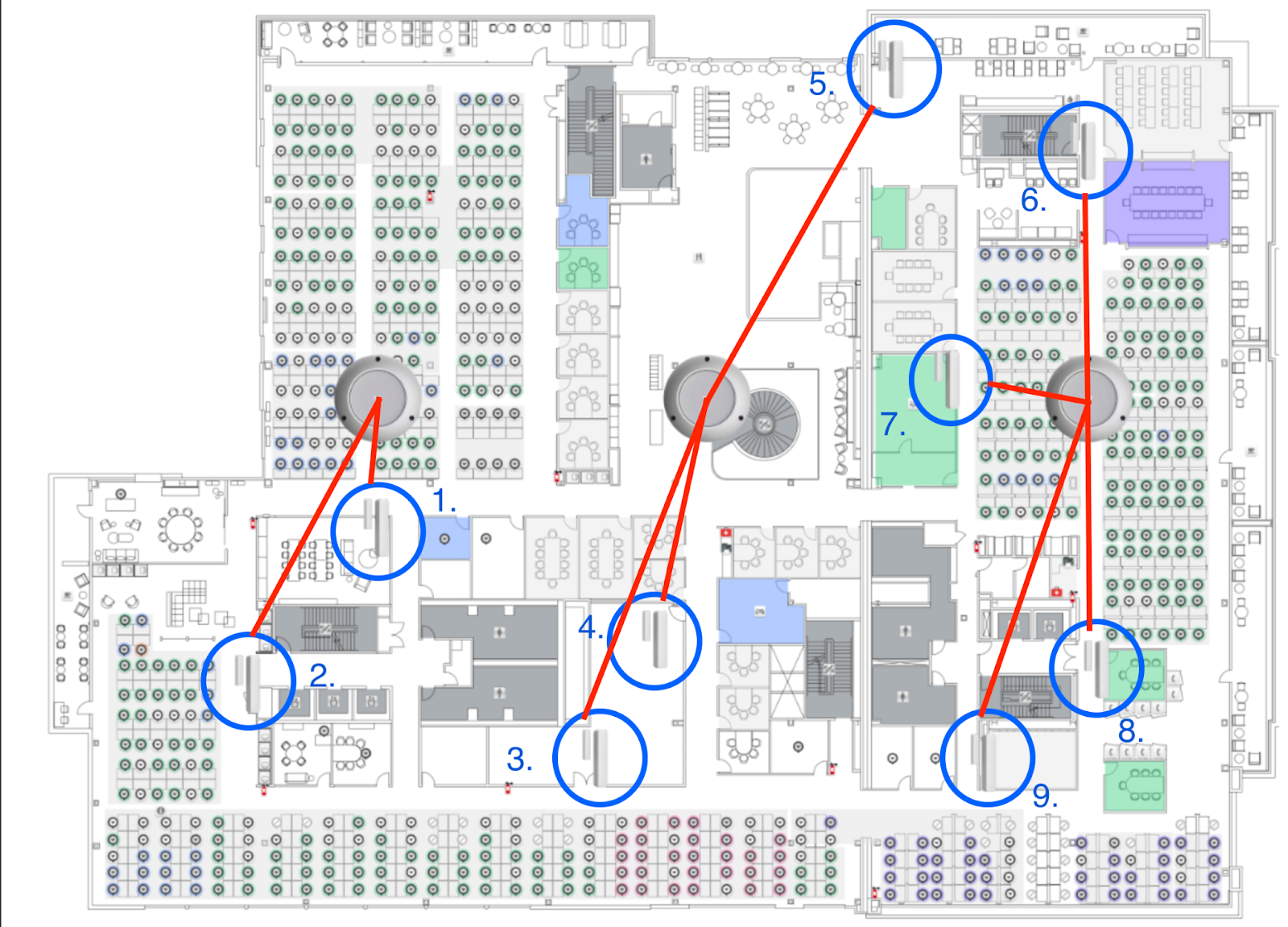 たとえば、Verkada HQの3階には、青い円で示された9台の無線センサーがある広いエリアがあります。