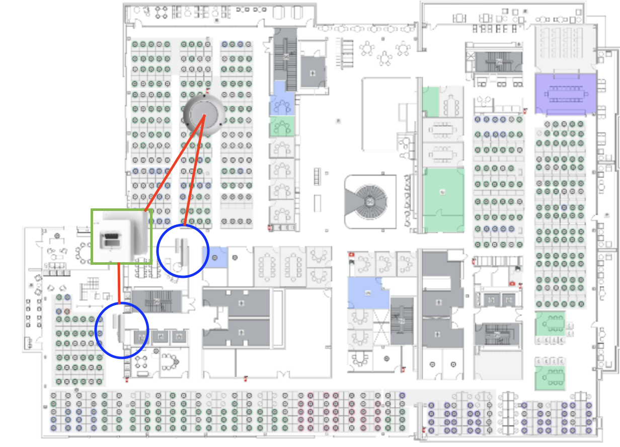 上に示した3台のような最小限のハブ配置では、多くのエリアで十分でないカバー範囲になります。たとえば中央のハブは、3番と4番のセンサーを担当しますが、これらは60〜70フィート離れた部屋の中にあります。この配置では、下のスクリーンショットで緑色で示したように、ハブの信号を3枚の壁が遮るため、信号の問題が発生する可能性があります。